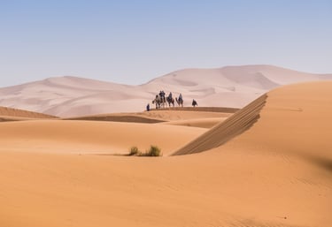 Awake early to witness the spectacular Sahara sunrise illuminating the vast Erg Chebbi dunes. After breakfast, visit the nearby village inhabited by the local nomadic community, where you can share traditional Moroccan tea and discover ancient rock engravings. Explore the desert landscape further with options to hunt for fossils or visit pre-Islamic tombs. In the afternoon, enjoy a second camel ride across the dunes to witness another captivating sunset. Conclude the day with a delicious dinner and overnight at your desert camp.