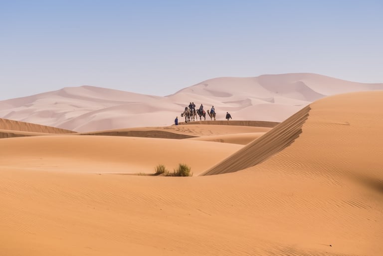 Start your day with a guided tour of Skoura’s lush palm groves and explore traditional kasbahs, learning about local customs and community life. Journey onwards to the spectacular Todra Gorges, with its towering 300-meter cliffs. Visit a traditional ksar (fortified village) in Tinejdad and explore the historic Jewish quarter and ruins of Sijilmassa in Rissani. Arrive at Merzouga, gateway to the majestic Erg Chebbi dunes. Transition from your 4x4 to camelback for a memorable trek into the Sahara desert, arriving at your comfortable desert camp in time for an unforgettable sunset. Enjoy a delicious dinner and spend the night in a tent equipped with modern amenities.